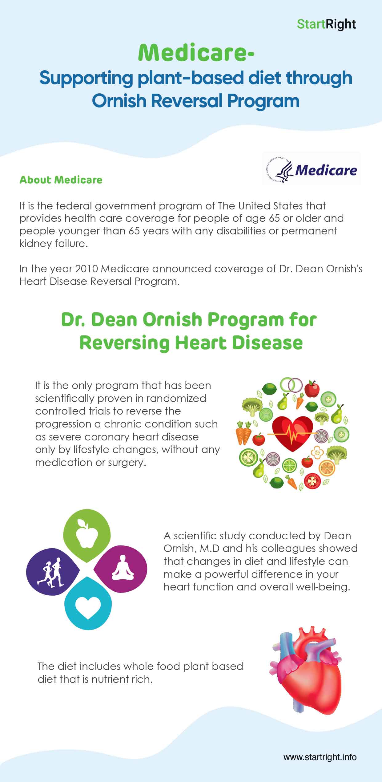 Infographic![]() Click Here | About Medicare Medicare is the federal government program of The United States that provides health care coverage for people of age 65 or older. In some cases, people younger than age 65 can also qualify for Medicare, such as those with disabilities or who have permanent kidney failure. The Medicare program is governed by the federal agency – Centers for Medicare & Medicaid Services (CMS). This program only helps with the cost of treatment. By evaluating the evidence, U.S. Medicare system started to cover Dr. Dean Ornish cardiac Reversal rehabilitation program that includes a plant-based diet. |